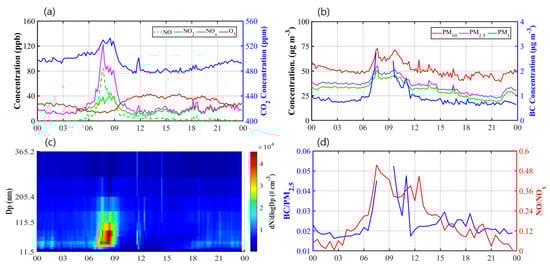 Time series of (a) gaseous pollutant (NOx, NO, NO2, O3, and CO2) concentrations, (b) particulate pollutant (PM10, PM2.5, PM1, and BC) concentrations, (c) size distributions of UFPs, and (d) concentration ratios (BC/PM2.5 and NO/NOx) measured at the stationary measurement location averaged over the P1D and P2D periods. The average time interval is 10 min except for the concentration ratios (30 min).