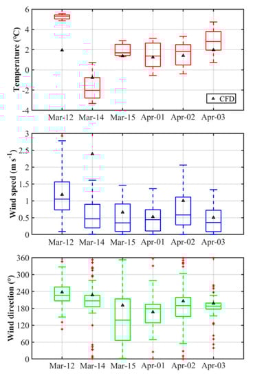 Boxplots of air temperature, wind speed, and wind direction of AWS observation data compared with CFD simulation results at the roadside location of Toegye Intersection. The number of data point is 60 min × 6 days (n = 360).