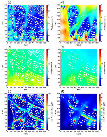 Simulated six-day averaged horizontal (a) wind speed, (b) air temperature, and (c) NOx concentration fields at a 1.5 m altitude and horizontal (d) wind speed, (e) air temperature, and (f) NOx concentration fields at a 30 m altitude during the P1D and P2D periods.