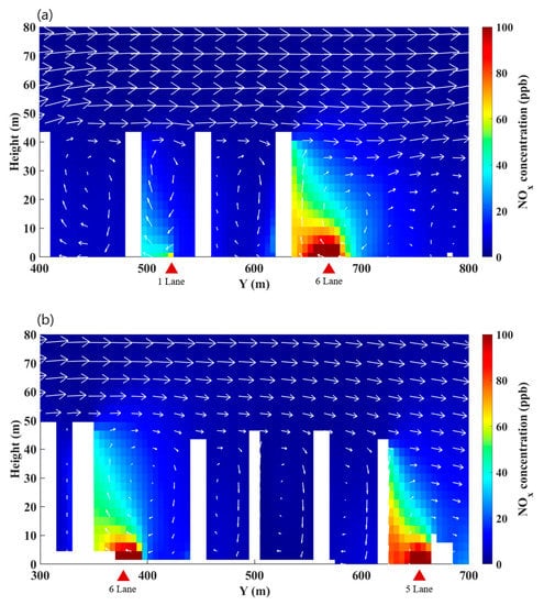 The y-z vertical cross-sections of simulated NOx concentration fields at (a) x = 207 m and (b) x = 705 m. The arrows indicate the wind vectors of v and w components.