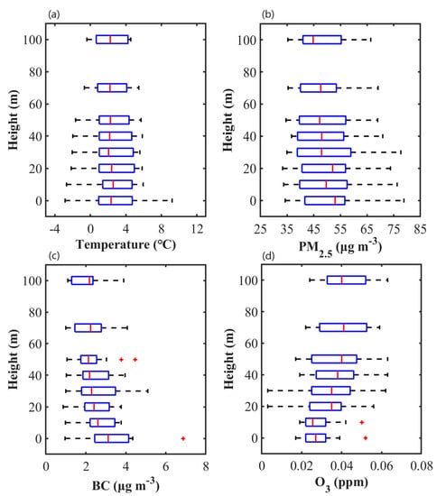 Vertical profiles of (a) air temperature, (b) PM2.5, (c) BC, and (d) O3 concentration boxplots for six days of P1D and P2D periods. A number of measurement data is 18 per each altitude.