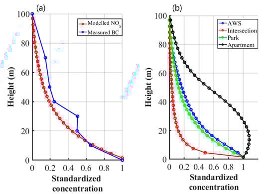 Standardized vertical profiles of (a) simulated NOx and measured BC concentrations at the drone measurement location and (b) simulated NOx concentrations at selected locations (i.e., AWS, Intersection, Park, and Apartment) around the road intersection.