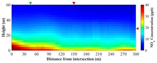 Composited cross-section of simulated NOx concentration in terms of distances from the intersection at a model grid interval regardless of direction. Green and red markers denote the drone and stationary measurement locations, respectively.