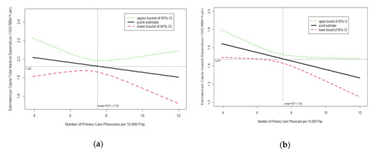 As the backbone of the primary healthcare workforce, primary care physicians play a vital role in controlling medical expenses and guiding patients in terms of reasonable health needs [22]. Our study confirmed that, in the context of China, there is a significant negative correlation between the primary care physician supply and per capita hospital medical expenditure. Several studies in the United States also found that a higher proportion of primary care physicians in an area was associated with a lower level of spending (measured by per beneficiary Medicare spending and Medicare end-of-life spending) [21,34,48,49]. Evidence shows that, compared with specialists, primary care physicians lead to savings in public medical resources, such as hospitalizations, prescriptions, common tests, and procedures [49,50]. They also provide more comprehensive health services, better preventive care, and early management of health problems [21], which may also lead to a reduction in medical expenditure.