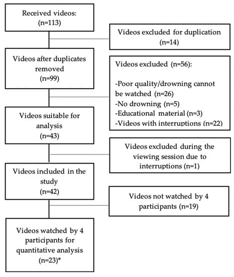 At the same time that the experts had been invited to consider participation, the same experts were requested to submit publicly available videos that could be considered to be used for the study. One hundred and thirteen videos were submitted by 13 persons. Finally, 43 were deemed eligible by A.C-.F. and C.A-.G. for the analysis of the drowning behaviour as they showed the beginning and end of the drowning process without interruptions and were of sufficient quality to be analysed (Figure 1).