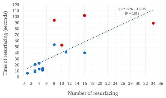 Figure 2 shows the linear regression model between the duration of the struggle and the number of resurfacing events (R2 = 0.531; F = 16.957, p = 0.001).