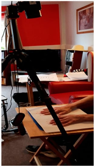 Long wave infrared imaging detector mounted on a tripod. The figure shows the participant during imaging with hands positioned upon a paper ‘hand template’ overlying an insulated tile. The portable table was used throughout the study to ensure consistency of the imaging set-up.