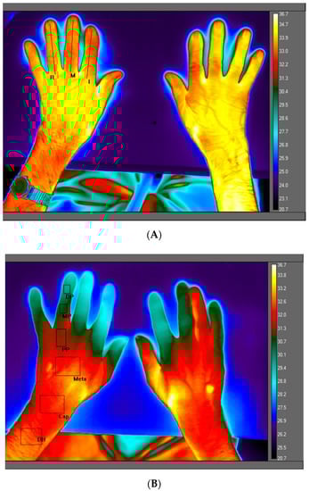 This provided visual orientation to the participants for the placement of fingers and hands in a consistent position and to obtain a clear field of view (FOV). After checking detector focus and distance, a maximum of three images were obtained. Colour thermal maps were obtained using a proprietary FLIR software (FLIR Systems AB, Täby, Sweden) and colour palette (see Figure 2).