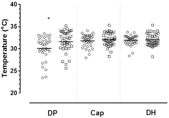 Right hand was dominant in 63 of 69 residents (91%). Thermal mapping and data analysis of ‘non-dominant’ finger/hand ROIs were therefore performed predominately for left hand. Individual extremity skin temperature values for TDP, TCap, TDH for all residents are lowest for TDP. Mean vales for TDP, TCap, TDH were 30.9 °C (2.6 °C), 31.9 °C (1.5 °C), 31.9 °C (1.3 °C) respectively. Mean TDP was significantly lower (p = 0.01) for residents with dementia compared to ND (Table 1; Figure 3).