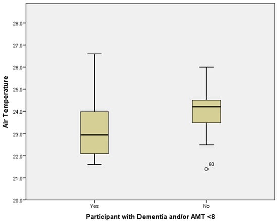 Distribution of air temperature (°C) within care homes by group: dementia or an AMT < 8 (yes/no) showing median, lower and upper quartiles, and lower and upper extremes of air temperature. Outlier: participant studied at lowest Ta, 21.4 °C.
