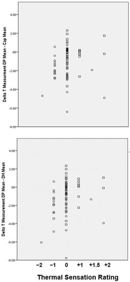 In addition, Pathak et al. [] have shown that skin temperature gradients are significantly related to resting metabolic rate such that air temperature of 25 °C may serve as an objective measure for the conditions to maintain homeothermy. Looking further at both extremity skin temperature, Wu et al. [] report finger temperature above 30 °C (and finger-forearm temperature gradients close to 0 °C) to represent a significant threshold for an overall sensation of thermal comfort. Furthermore, at mean air temperature of 26.8 °C, Wu et al. [] report temperature gradients between fingertip to wrist and fingertip to forearm ranging from −3.5 to 0.3 °C and −4.0 °C to −0.3 °C respectively; the negative temperature gradient serving as an indicator of a ‘cool’ TS response.