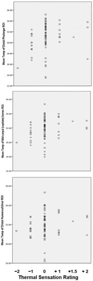 In the thermoneutral zone, skin blood flow in the hands is tonically active and vasomotor tone of skin capillaries operates as the primary ‘controller’ of deep body temperature. Hands (and feet) represent ‘radiator’ organs [] losing heat to the environment as well as retaining and conserving body heat. Skin temperature therefore varies with changes in vasomotor tone. Capillaries of non-glabrous skin, along with arterio-venous anastomoses (AVAs) of glabrous (hairless) skin of hands and feet are continuously adjusting (cycling) blood flow to extremity skin to balance heat loss with heat retention [,]. These physiological measures, independent of an individual’s TS perception may provide a more robust indicator of temperature derangement than achieved through thermal comfort scales, especially under conditions where there is a risk of ‘symptomless cooling’ [,]. If it is possible to measure and/or ‘see’ the consequences of marked vasoconstriction (or vasodilation) at the extremities this may provide a more reliable indicator of thermal risk; ‘cooling without noticing’. We have shown previously [], as have others [], that the feeling of being chilled tends to start in the hands or feet. Harazin et al. [] report finger skin temperature (at a ‘cut-off’ temperature below 29 °C) in adults (with vibrotactile perception disorders consequent on peripheral neuropathy) as a characteristic of ‘cold hands’ even in air temperature above 21 °C.