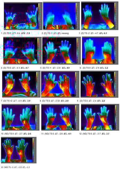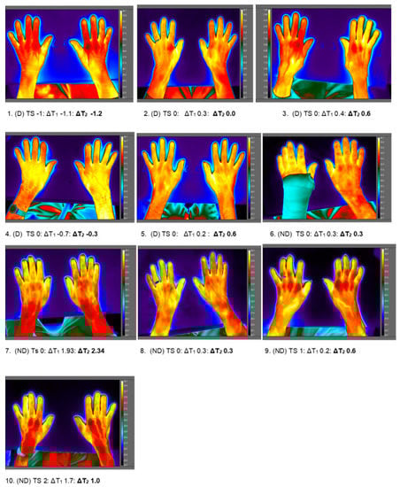 (B) ‘Warm hands’: By contrast (Figure 8) the brightest colour appearance visually on thermograms corresponded with highest hand temperatures in 10 residents (5 D; 5 ND) (mean TDP 31.7–35.2 °C; median 33.7 °C) across air temperature of 21.9 °C to 25.3 °C (median 22.9 °C) i.e., similar air temperature to those with cold hands. Individual thermal sensation ratings for this group were: −1 (slightly cool, n = 1); 0 (comfortable/neutral, n = 7), 1 (slightly warm, n = 1) and 2 (warm, n = 1). Temperature difference across the hands for ∆T1 ranged from −1.1 °C to +1.9 °C (median 0.3 °C). Similarly, for ∆T2, mean temperature differences between ROIs was small: range −1.2 °C to +2.34 °C (median 0.45 °C).