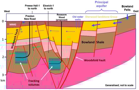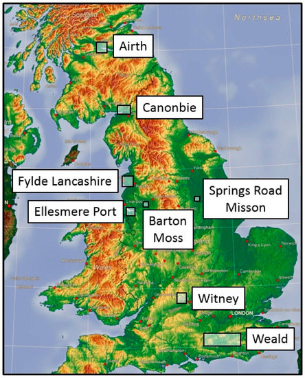The two major aquifers in the UK are the Chalk and the Sherwood Sandstone Group. Each of these usually lies above, or adjacent to, formations that are being exploited unconventionally—the Kimmeridge Clay Formation and the Bowland Shale, respectively [7]. Faulting, which is complex in the UK, compared to, say the shale basins of the USA, provides the pathway between deep and shallow groundwater systems. Therefore, the intrinsic risk of contamination of the aquifers is high.