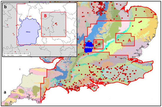 - Gallois, R.W.; Worssam, B.C. Geology of the Country around Horsham; Memoir for 1:50,000 Geological Sheet 302 (England and Wales); British Geological Survey: London, UK, 1993. [Google Scholar]