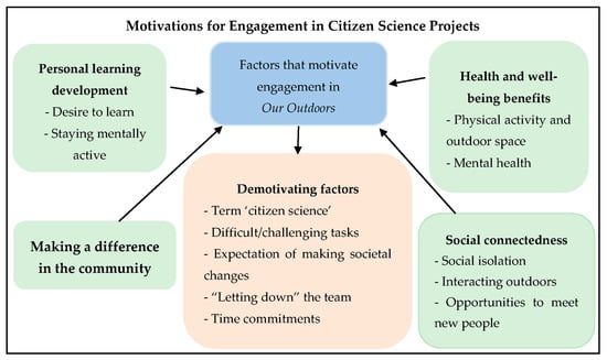 The primary aim of this study was to understand what motivates engagement with citizen science projects such as the Our Outdoors initiative. Citizen science projects which focus on health present a unique opportunity for participants. Participants have the potential to simultaneously contribute to their local communities in a positive way and gain health benefits from participating. The findings of this research will allow the organisers of similar citizen science projects to plan the design projects in order to optimise recruitment and to continue meaningful engagement. This will help ensure that as many people as possible can gain the likely health benefits that involvement in such projects can provide.