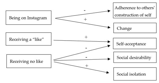 - Self-acceptance and social desirability are higher on Instagram and after receiving a “like” and lower after receiving no “like” than when adolescents evaluate themselves offline, as suggested by the results of previous studies [57,58,59] on the impact of Instagram on self-esteem.