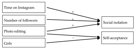 The increase in usage frequency, the number of followers, and the editing of posted photos predicted the increase in social isolation on Instagram, thus suggesting that this effect is dependent on these aspects, but not on gender and age of the user. Previous studies [76,77] confirmed that these latter aspects might not predict an increase in social isolation. Instead, there is some previous evidence to suggest that spending excessive amounts of time on SNSs can lead to symptoms of depression, which can then increase the risk of social isolation [31].