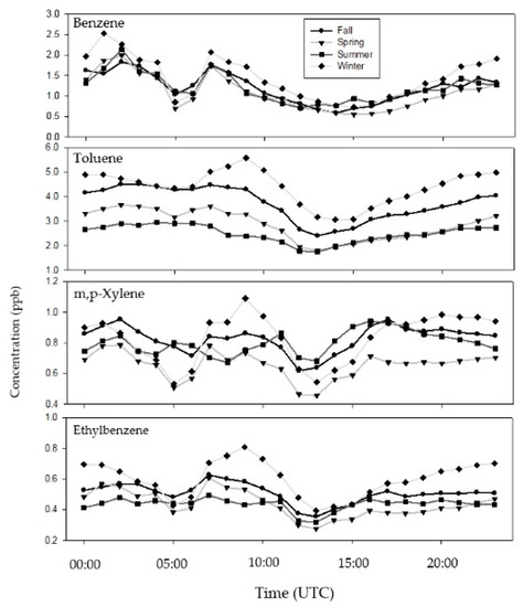 Figure 1 shows BTEX average diurnal variations in each season during the study period. For example, the concentration of BTEX compounds became relatively lower in the daytime (from 10:00 to 15:00) with the lowest concentration observed at ~13:00. This is consistent with what has been reported in Shanghai for a similarly-situated large industrial estate [35]. Such a diurnal trend is likely caused by strong solar radiation and intense air convection in the daytime, both of which can photochemically react with and/or dilute VOCs [35]. In contrast, as shown in Figure 1, we can see higher BTEX concentrations during rush hours both in the morning (7:00 to 9:00) and late afternoon (~18:00), similar to the findings in previous studies [36,37]. Such a high concentration also suggests that automobile exhaustion was an important source for atmospheric BTEX in the study area. Figure 1 further shows similar diurnal variations of BTEX across four seasons, indicating that the BTEX concentration is contributed from similar sources and dispersion mechanisms in each season. In addition, some variances of BTEX concentrations in Figure 1 are likely influenced by many factors such as emission sources (mainly from vehicular exhaust, gasoline, and solvent evaporation), meteorological conditions, and their sinks, given that the study area is located in the industrial area of Kaohsiung. Indeed, benzene, toluene, and xylenes are typical tracers of vehicular exhaust, industrial production, and solvent usage, respectively [38,39]. This also explains why Figure 1 shows distinct diurnal variations of BTEX concentration in each season.