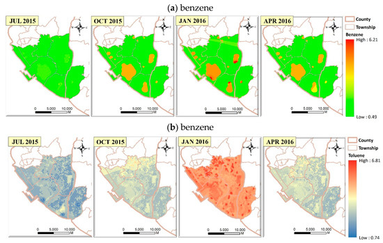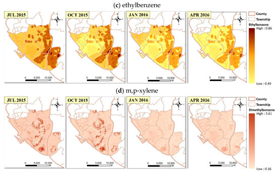 By using the XGBoost-Hybrid LUR model for representative months from 2015 to 2016 (July, October, January, and April), Figure 2 shows the monthly average BTEX concentration through the study period. To begin with, the spatial variation in each season was relatively consistent, probably because the season and temperature factors were too insignificant to be selected into the models (Table 1). Second, there are higher benzene concentrations (light yellow to red color in Figure 2a) near industrial parks because of the higher partial R2 for the factor of industry in the benzene model (Table 1). Third, as shown in Figure 2b, we see higher toluene levels scattering in places closer to the city or roads (red color in Jan 2010 in Figure 2b) because NOx, which is the major pollutant of traffic, had higher partial R2 in the toluene model (Table 1). Fourth, higher ethylbenzene concentrations (dark brown color in Figure 2c) were shown in certain residential areas with many temples and near industrial parks because of the higher partial R2 for the factor of both industry and temples in the ethylbenzene model. Fifth, higher m,p-xylene concentrations (dark brown color in Figure 2d) were seen also in certain residential areas with many temples because of the higher partial R2 for the factor of temples in the m,p-xylene model.