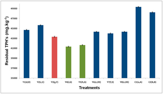 The initial concentration of TPH for all treatments was 50,000 mg·kg−1. After an incubation period of 80 days, it was observed that treatments Y4 and Y5 presented a higher level of TPH removal (8667 and 8334 mg·kg−1, respectively). Bioremediation depends mainly on soil characteristics and pollutant aging [45]. The presence of high organic matter content and clay may affect the extent of biodegradation due to a priming effect on microbial communities and a decrease in accessibility to microorganisms [46]. The bioavailability of hydrophobic compounds could be reduced by entrapping the compounds into the solid phase of the organic matter [47].