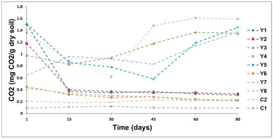 The microbial activity was measured using the production of CO2 (Figure 3). CO2 production in this response was measured over the course of the entire incubation period, with production as a variable across all treatments. The results showed an active microbial population [63]. The treatments presenting the highest levels of CO2 production were Y4 > Y5 > Y7 > Y3. The CO2 production at different treatments changed in time. The selected nutrients presented an increase in the growth of indigenous microorganisms and P. fluorescens. These results suggest that the increase in CO2 may be related to the degradation efficiency of TPH.