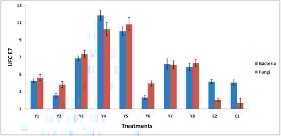 Figure 4 shows that the bacteria population is larger for treatments Y4 > Y5 > Y3, which could be due to the addition of P. fluorescens as a bioaugmentation system. Various studies have shown that the significant increase in viable bacterial counts is due to the enrichment of the soil because of the nutrient biostimulation [68,69,70,71,72].