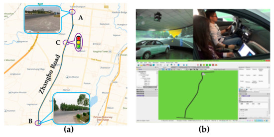The driving experiments included actual driving and virtual driving experiment. We used two experiment vehicles equipped with a multi-function speed-measuring instrument, laser range sensor, video capture system, and notebook computer for the actual driving experiments (Figure 1a), and used a virtual driving platform for the virtual driving experiment (Figure 1b). In the actual driving experiment, we used two vehicles to simulate the car-following scene. One of the vehicles, as the front vehicle, ran normally along the experiment route with a velocity of 60 ± 5 km/h and a participant drove the following one. The urban roads, which are full of intersections (signalized and no signalized) and corners, were not the ideal experimental environment. Considering the high safety risks involved in driving experiments, the enclosed expressway was not selected either. Finally, we chose a semi-enclosed road section of Zhangbo Road (Figure 2a) that was located far out of the city and connected the Zhangdian District and Boshan District as the actual driving experiment route. The whole length of the route was about 9.8 km (between points A and B in Figure 2a) and had a 70 km/h speed limit. The experiment vehicles were essentially independent of the crossing or merging effects of the vehicles on other roads except for a signalized intersection (due to regional conditions, the probability of signalized intersection was minimized), which was noted as point C in Figure 2a. In order to avoid the mandatory effect of the signalized intersection on driving intention, we did not use the data collected from 100 m before and after the intersection. We organized the actual driving experiments in off-peak periods under good weather and road conditions. We applied the virtual driving platform (Figure 1b) to carry out the virtual driving experiment. The virtual road section was structured (Figure 2b) in the platform according to the road basic properties and traffic volume of the actual experiment route. We created the car-following scene and collected the driving data in the platform.