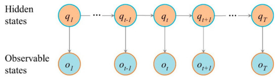 The HMM is a statistical analysis model that can be represented a set of hidden states , a set of observable states , the initial state probability matrix , the transition probability matrix and the emission probability matrix [24,25,26]. Where, is the number of and is the number of . is the hidden state and is the observable state. represents the at . represents the transition probability between the states, indicating the probability that the state is true at when the state is true at . represents the probability that the is true when the is true at . We represented the HMM as . Hypothesizing the hidden state is dependent on its previous moment only, and the observable state is dependent on the hidden state of the Markov chain [27]. An HMM can be represented as a probabilistic network (Figure 3).
