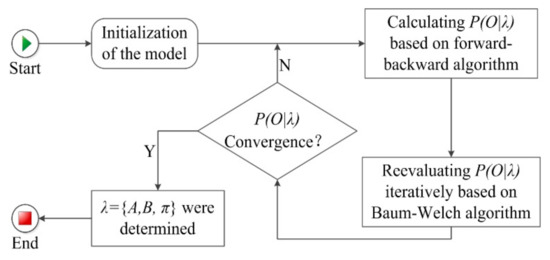 The model training was to determine the value of , and . The process of model training was, firstly, to initialize the model parameters when the observation sequence , state sequence , all possible sets of observations , and all possible sets of hidden states were known. Secondly, we worked out the probability of the observation sequence through the forward–backward algorithm [29]. Finally, we determined the convergence and the model parameters through the Baum–Welch algorithm [30]. Figure 5 shows the model training process. We describe the key steps of model training in Supplementary Materials 1. We used 68.5% of the original data to train the model.