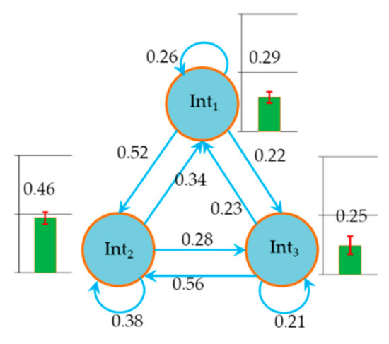 We obtained the probability of intentions by model training. The probabilities of deceleration (Int1), keeping speed (Int2) and acceleration (Int3) were 0.247, 0.468, and 0.285, respectively. Figure 6 shows the state transition probability (). As can be seen from and , the probability of Int2 was significantly higher than that of acceleration and deceleration. This indicated that the results of model training were in line with the reality, because the driver would be driving in a stable state until the driving environment changed. The fact that the probabilities of Int1 and Int3 transferring to Int2 were larger than other transition probabilities also proved this. We show the probabilities of observation states () in Supplementary Materials 2 and discuss the change law of in the discussion section.