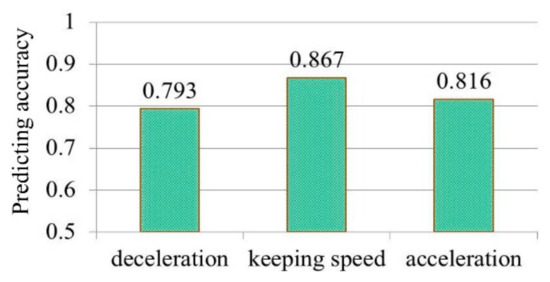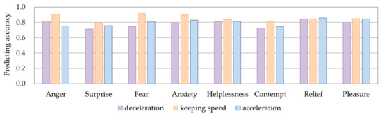 We used the HMMs proposed in this study to predict the driving intention adapting to driver’s different emotional states. We applied the rest of the data sets, which were unused in model training, to verify the accuracy of the proposed models. We obtained the accuracy of the models in predicting the driving intention by comparing the predicted value and the actual value of the vehicle acceleration. Figure 14 shows the accuracy in predicting driving intentions of the HMM for different emotions. The results showed that the prediction accuracy for the deceleration, keeping speed, and acceleration intentions in different models reached a similarly acceptable level.