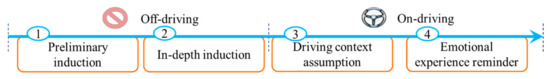 It is difficult to induce an individual’s emotions effectively and measure the level of emotional arousal accurately [40]. The methods most used in emotion induction research were movie clips [41], personalized recall [42], picture viewing [43], acoustic material [44] and standardized imagery [45]. Analysis results showed that music, movies and imagery were relatively ideal methods for emotion induction and the success rate was more than 75% [46,47]. Yet the driver, generally speaking, needs to spend most of his/her attention on the driving, which further increases the difficulty to induce the specific emotions needed. In order to effectively induce and maintain the driver’s emotions while driving, while minimizing the impact on driving tasks, we designed a new emotion induction process. The emotion induction process contained four steps (shown in Figure 9). The preliminary induction and in-depth induction carried out before the driving experiments, and the driving context assumption and emotional experience reminders implemented while the participants drove the car.