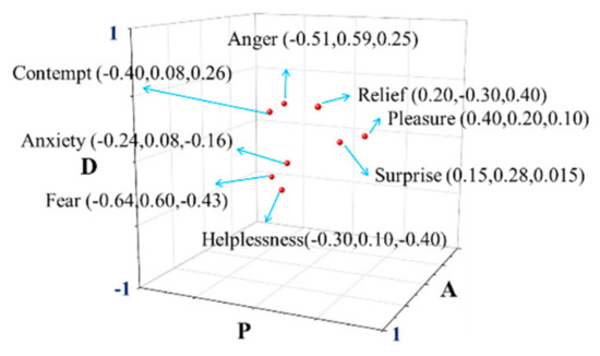 Distribution of the eight emotions in PAD space.