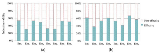 In order to ensure the data were valid, we carried out the tests on the effectiveness of emotional induction. In the driving experiments, drivers reported PAD values for their emotional state every minute. Therefore, in each emotion state, we obtained 620 emotion indicator results in the actual and virtual driving experiment, respectively. Each ser of emotion indicator data represented the driver’s emotional state within a minute. We took the Euclidean distance between the reported coordinates (reported by the participants in the driving experiments) and converted coordinates of emotion in the PAD three-dimensional space as the measurable criteria of emotion activation [62]. The closer the distance was, the higher the emotion activation degree was. In the measurement tool of the PAD model, the coordinate difference value of each dimension state was 0.25. Therefore, Euclidean distance less than 0.25 from the reported PAD to the corresponding emotional coordinate point in the PAD original three-dimensional space indicated that the emotional state was effectively induced. According to this criterion, we obtained the percentage of effective emotional data on the total data for each emotion state (Figure 12) and the deleted non-effective emotional data.