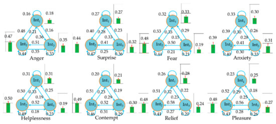 We obtained the probability distributions of the three driving intentions in different emotional states and the transition probability between the three intentions in the proposed HMMs by model training. Figure 13 shows the training results. Compared to the natural state, there was no significant change in the probability distribution of Int2 under other emotion states, except for anxiety. In the state of anxiety, the probability of the driver keeping speed decreased significantly, while the probability of accelerating and decelerating both increased. In addition, the probability of acceleration increased dramatically. The same rule of probability increase and decrease also applied to the intention in the state of surprise emotion, but the change in probability was less obvious than that in the anxiety emotion. In the states of anger and contempt, the driver’s intention to decelerate reduced significantly, while the probability of accelerating intention increased observably, and the probability of keeping speed increased slightly. In fear and helplessness, the intention to accelerate significantly reduced, and the probability of maintaining speed increased to a certain extent. The probability of a driver to decelerate increased significantly in fear, but decreased significantly in helplessness. Aside from the fact that that the probability of Int1 increased significantly in the pleasure state, the probability distribution law of other driving intentions did not change significantly in the relaxed and pleasure state compared with the natural state. Corresponding to the change in the probability distribution, if the probability of one driving intention increased, the transition probability of the other two driving intentions to it would increase too. On the contrary, if the probability of one driving intention reduced, the transition probability of the other two intentions to it would reduce. We showed the probabilities of observation states for different emotions in Supplementary Materials 2 and discussed the change in the law of observation sequence in the discussion sections.