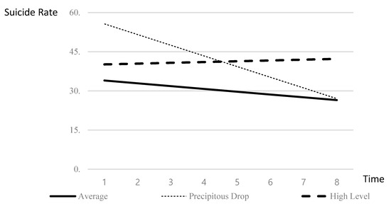 Second, the proportion of elderly residents and number of social welfare facilities are significantly linked with the ‘precipitous drop’ pattern. This finding indicates that the districts that have a high proportion of elderly residents and a high number of social welfare facilities also display a sharp decrease in the suicide rate. In other words, it suggests that when there are more public supports in a district with a higher proportion of elderly residents (an at-risk population), the suicide rate may drastically improve.