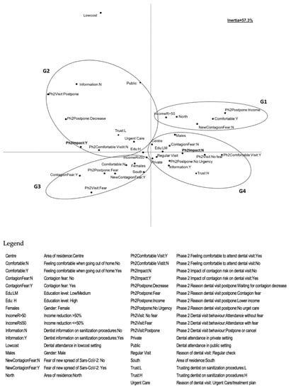 Association between socio-demographic characteristics, dental care access, the fear of severe acute respiratory syndrome coronavirus-2 (SARS-CoV-2) contagion during Phase 1, the approach with dental care visit during Phase 2, the perception of the impact of the risk of contagion on dental care and trust in dentists regarding sanitization procedures. Results of the Multiple Correspondence Analysis (MCA): briefly, G1 group is characterized by subjects coming from North Italy that are not afraid of a new spread of the virus; G2 group identifies subjects with high level of education that would not feel comfortable in undergoing a dental appointment; G3 group refers to subjects coming from South Italy that would postpone a dental appointment; G4 group includes subjects with low or medium level of education that would feel comfortable in undergoing a dental appointment.