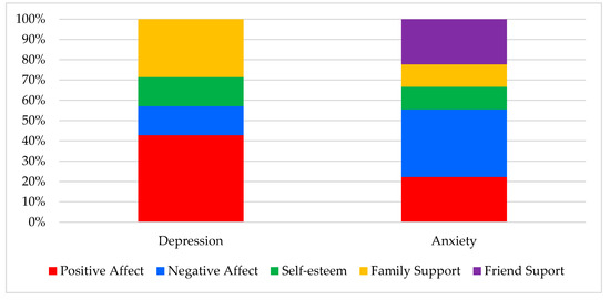 Regarding the relationship patterns between depression and anxiety levels and affectivity, self-esteem, and social support, Table 2 shows the Spearman correlation coefficients obtained. Interestingly, no relationship was found between depression and anxiety scores. The depression score showed significant and negative correlations with PA, self-esteem, and family/friend support, and a positive and significant correlation with NA. In this case, the relationship pattern was less robust than with PA. This pattern was observed in females and males. Yet, considering social support, females showed a higher negative correlation with family support, and males did with friend support. The anxiety score showed some differences with depression score correlation patterns—in this case, we found higher correlations with PA. Social support reached lower coefficients compared to depression level, both in males and females, and the correlation between anxiety level and support from friends did not reach statistical significance in males.