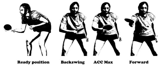 - Bańkosz, Z.; Winiarski, S. The evaluation of changes of angles in selected joints during topspin forehand in table tennis. Mot. Control. 2018, 22, 314–337. [Google Scholar] [CrossRef]