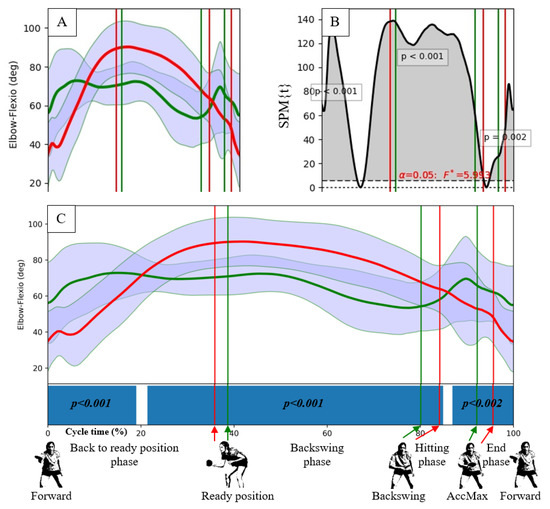 The data obtained in the study (all the data is available in Supplementary Materials) made it possible to reproduce the pattern of movement in the joints during topspin backhand strokes in the athletes studied. The pattern is presented in Figure 4, Figure 5 and Figure 6 where the horizontal lines represent the mean ± standard deviation (SD), the vertical lines are the individual identified events, and the fields at the bottom show the ANOVA SPM(t) test results.