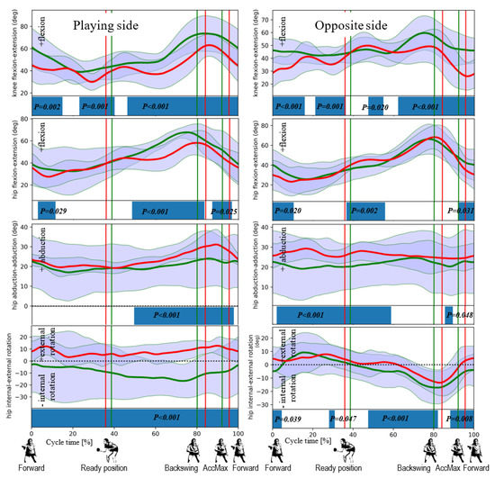Differences in low-extremity angular kinematics between female (in red) and male (in green) players revealed by the SPM for knee flexion-extension, hip flexion-extension, hip abduction-adduction, and hip internal-external rotation for the playing side (left column) and opposite/contralateral side (right column). The statistically significant differences (for p < 0.05) are marked on the horizontal bar.