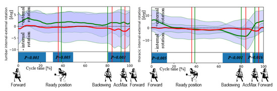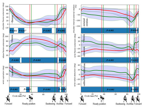 The course of movements in the analyzed joints was accompanied by a large (p < 0.01) variability between the two groups determined using the ANOVA SPM test. Perhaps this was also caused by the sizable intragroup differentiation in the groups of men and women, a phenomenon proved by the high SD values and emphasized in our previous studies [26,37]. The differences revealed by the SPM test are likely also related to a different time of occurrence of events and duration of individual phases. In women, the backswing phase started earlier and was longer than in men, which caused a shift at the beginning of the hitting phase. Similarities in the coordination of movement are observed, for example, in the joints of the lower limbs. In the knee joints, despite generally similar movement directions in the individual phases, the SPM test showed no differences between the groups only in about half of the back to ready position phase and at the beginning of the backswing phase. The smallest number of periods with different patterns can be observed during the flexion/extension movement in the hip joints, especially on the non-playing side. There was flexion in the backswing phase in both groups. Next, before the beginning of the hitting phase, the extension movement starts; this is a period without intergroup differences (from ca. 55% to 95% of the hitting cycle) on the non-playing side. The differences are significant in the hip joint on the playing side in this part of the cycle (hitting phase), although the directions of movement are similar. This effect is probably due to the higher speed and slightly higher range of this movement in men. Differences can also be observed in abduction, although the directions of movements are similar in both groups, and the change in direction occurs at similar moments of the cycle.