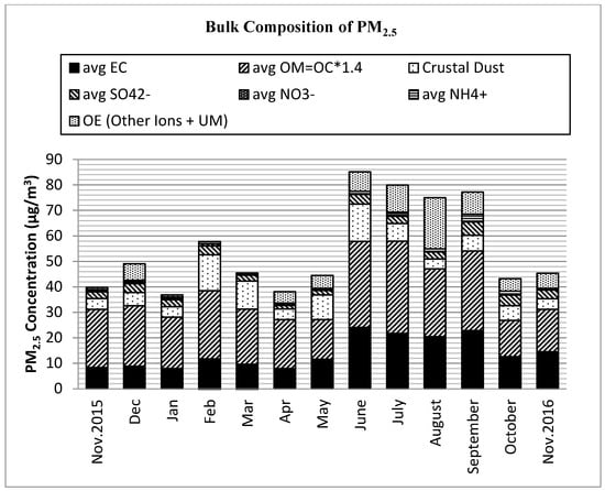 For comparison, Sharma and Mandal reported that the average mass concentration of fine PM was 125.5 ± 77.2 μg/m3 (range: 31.1–429.5 μg/m3) in Delhi (India), which is one of the most polluted cities in Asia. In Delhi, particulate organic matter (OM) is the highest contributor to PM2.5 mass, with 27.5%, followed by soli/crustal matter (16.1%), ammonium sulfate, and ammonium nitrate contributing 16.1% and 13.1%, respectively, while sea salt and light-absorbing carbon account for 17.1% and 10.2%, respectively [46]. The present study reported a higher OM and soil dust contribution to PM2.5 but a lower proportion of ammoniated compounds (ammonium nitrate and ammonium sulfate) compared to the Delhi study [46].