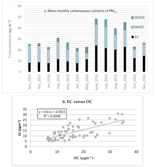 Water soluble and insoluble components of OC (WSOC/WIOC) and EC levels, along with the seasonal trend, are presented in Figure 2a. The majority of OC was formed from WIOC, comprising 78% of the daily mean of OC (i.e., daily mean concentration of WIOC, 12.9 ± 6.7 µg/m3). The monthly mean (SD) level of WSOC was 3.6 ± 3.1 µg/m3, ranging from undetectable levels to 10.9 µg/m3 in August 2016, which had the highest daily WSOC observation, after one extreme measurement in May and another two measurements in September 2016 were excluded. A spike in the concentrations of water soluble OC (WSOC) was observed during three observation days (10 May, 19 September and 25 2016) compared to concentrations of the respective OC levels, and the spike coincided with a religious ceremony which uses the burning of biomass, particularly tree branches and leaves, as part of the celebration. As it appears that these levels overestimated the concentration of WSOC, they were excluded from the analysis. Figure 2b shows moderate correlation between OC and EC, suggesting primary source particle pollutants dominate.