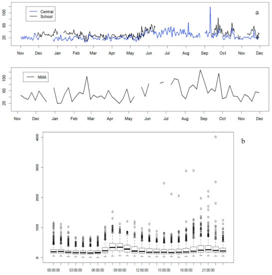 (a) Line graph of PM2.5 concentration (µg/m3) trend during all seasonality (i) during August 2016 through December 2017 (US Embassy sites: Blue line—Central and Black line—School) and (ii) during November. 2015–November 2016 (NMA—Met Office) site) in Addis Ababa. (b) Diurnal pattern of the concentration of PM2.5 (given in µg/m3) for two US Embassy sites, from August 2016–December 2017, in Addis Ababa.
