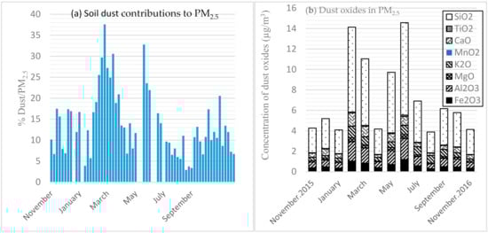 Oxides in dust (Al2O3, Fe2O3, TiO2, MgO, CaO, K2O, MnO2, and SiO2) contributed a daily average of 13.5% of PM2.5, with the highest contribution in February (37.6%), followed by two more peak days during March (30.6%) and May (32.8%), which are in the light rain (Wet 1) and dry seasons (a transitional period between the two wet seasons), respectively (Figure 4a). The monthly mean contributions of dust were 25.0%, 24.0% and 22.0% during February, March, and May, respectively. The lowest proportion of dust was observed during the heavy rain season (Wet 2), with mean daily (2.9%) and monthly (5.0%) dust contributions to PM were observed during August. The daily variation of the dust oxides over the study period is depicted in Figure 4a,b, as a percentage contribution to—and dust oxides of—PM2.5, respectively.