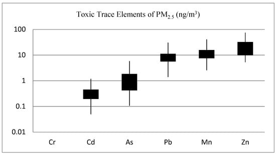 As shown in Figure 5, Cd, As, Pb, Mn, and Zn are among the toxic metals of public health importance analyzed in this study. Pb, Mn, and Zn have notable concentrations, with Zn having the highest mean levels. The mean (SD) Pb level was 8.4 ± 5.3 ng/m3; ranging from 1.7 to 68.0 ng/m3. Most of the toxic elements of health significance in crustal materials, including Se, Sb, Ag, S, Sn, Pb, As, and Cu, found in PM2.5 were found to be significantly enriched, beyond what is naturally occurring in geological materials [32], by anthropogenic sources in Addis Ababa. Supplemental Table S1, listed the crustal enrichment factor (CEF) of trace elements—with CEF>100 shown in bold.
