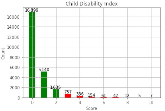 Distribution of the Child Disability Index (CDI). In red are the children that are categorized with a Severe Developmental Disability (SDD).