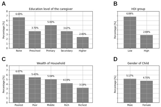 Percentages of SDD children for each category of the moderators: (A): Education level of the caregiver; (B): HDI group; (C): Wealth of the household and (D): Gender of the child.